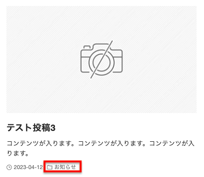 通常、カード型の投稿リストでは投稿日のすぐ隣にカテゴリー名が表示されます。
