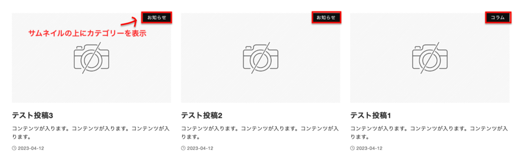 実現したいことは次のように、カード型投稿リストにおいて、サムネイルの上にカテゴリー名を表示することです。