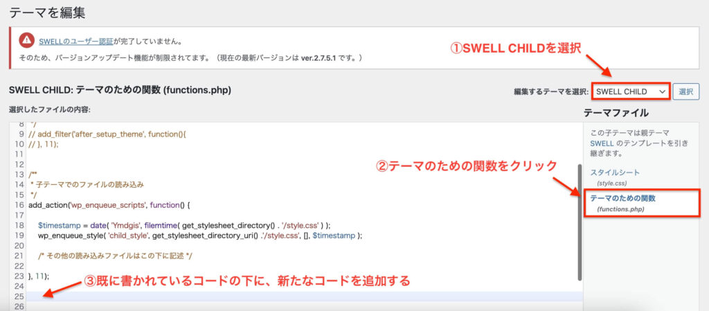 「編集をするテーマを選択」がSWELL CHILDとなっていることを確認し、「テーマのための関数」を開きます。このファイルがfunctions.phpです。