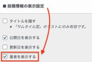 少し下の方にある「タイトル下に表示する情報」の中から、「タイトル下に著者を表示する」にチェックを入れます(下記参照)。設定は以上です。