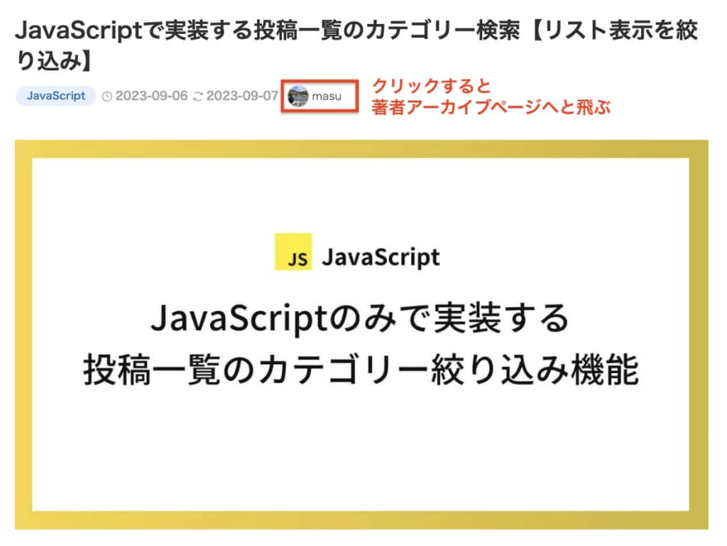 デフォルトでは投稿ページの著者アイコンと名前はリンクとなっており、クリックすると著者のアーカイブページへと移動します。