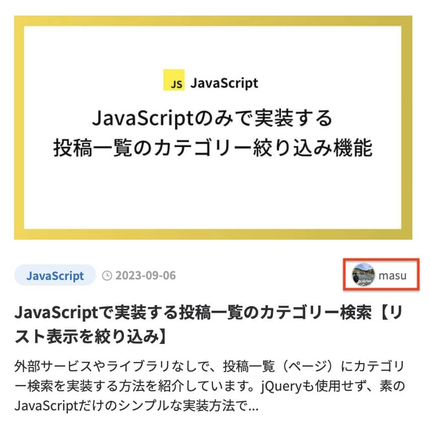 次の画像のように投稿リストページの各投稿の中に著者アイコンと名前を表示する方法です。