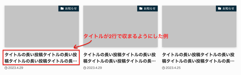 投稿リストのタイトルが長い場合に、2行で収まり末尾に「…」がつくようにCSSで調整しています。スマホやタブレットで見る時にも表示されるタイトルの文字数を制限しています。