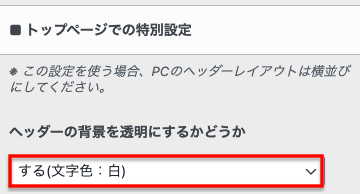 管理画面左側メニューから、外観>カスタマイズ>ヘッダー>トップページでの特別設定にある、「ヘッダーの背景を透明にするかどうか」を「する(文字色:白)」を選んでください。