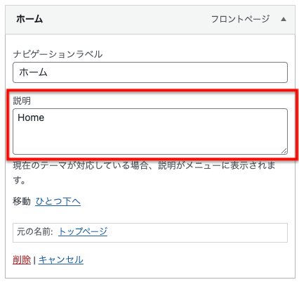 管理画面>外観>メニューからグローバルナビを開いて各メニュー項目の「説明」に英語のテキストを追加します。