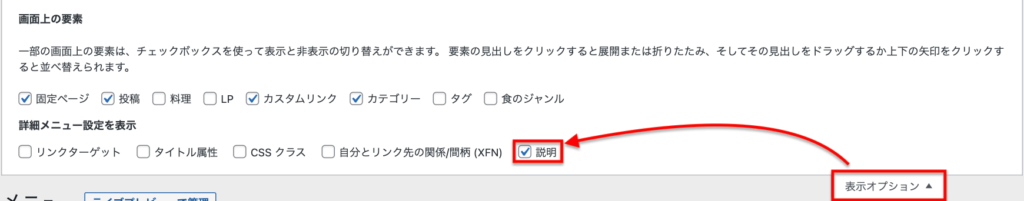 メニュー項目に「説明」が表示されない場合は右上の「表示オプション」をクリックし、「説明」にチェックを入れます。
