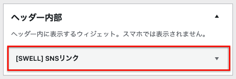 管理画面>外観>ウィジェットから[SWELL]SNSリンクを探します。そして「ヘッダー内部」を選択した状態で、ウィジェットを追加をクリックします。